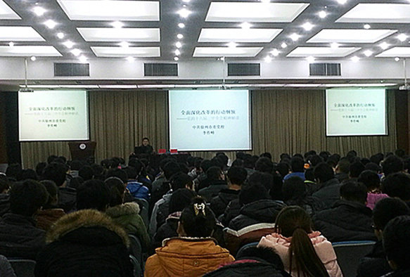 1218日下午,学校在图书馆多功能厅举行党的十八届三中全会精神专题辅导报告会,徐州市委宣讲团成员、市委党校李作峰教授应邀作专题辅导报告。学校二级党校教师和全校600余名入党积极分子听取了报告会,报告会由校党校副校长、宣传部刘一飞部长主持。