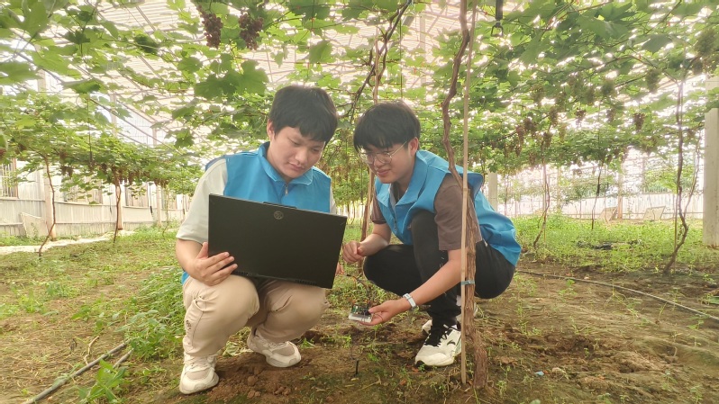 为将红色精神滋养转化为服务社会的实干担当,实践团奔赴徐州市贾汪区现代农业产业园。立足信息工程学院专业优势,团队创新开展“e脉助农”科技志愿服务。队员们深入田间地头与蔬果大棚,实地调研物联网、大数据等技术在产业园的应用现状与与发展需求,并针对新疆引进葡萄品种开展了土壤温湿度现场勘测。他们俯身田间,依托专业知识,耐心为农户提供网络维护、智能设备操作指导及大棚温湿度监测等技术服务,切实解决生产中的技术难题。“为者常成,行者常至。”队员袁涛涛深有感触地说:“主动‘自找苦吃’的实践不仅锤炼了专业技能,更让我们在泥土芬芳中切身领悟到科技兴农的深远意义,坚定了用信息技术服务地方发展的信念。”