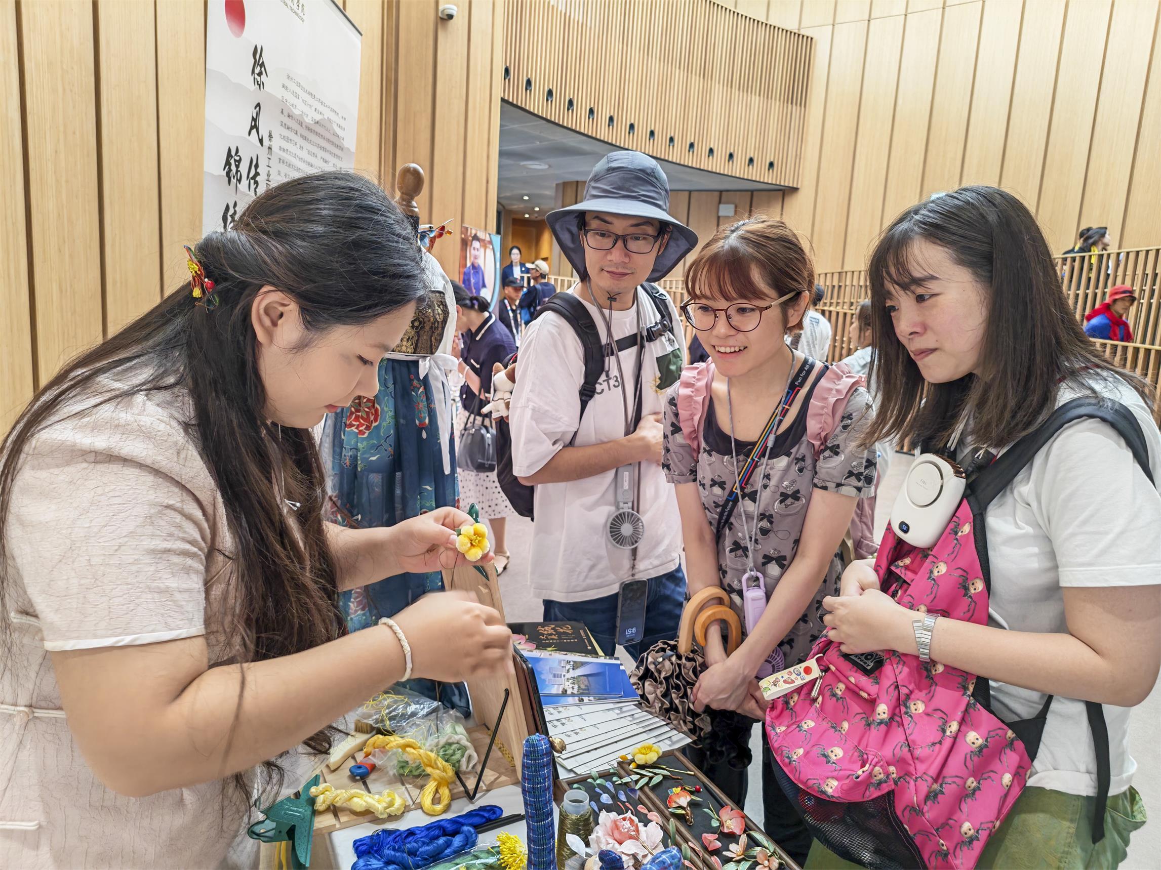 该校展区内,蕴含着两汉风韵的徐州香包、精美灵动的饰品绒花、典雅庄重的传统汉服等师生非遗作品琳琅满目,特色教材、宣传活页等系统展示了学校将非遗技艺转化为教学资源的创新成果。循环播放的学校多语种宣传片,吸引了众多国际观众驻足流连。