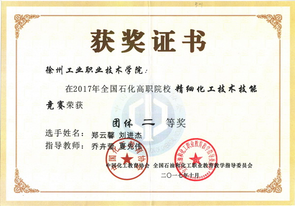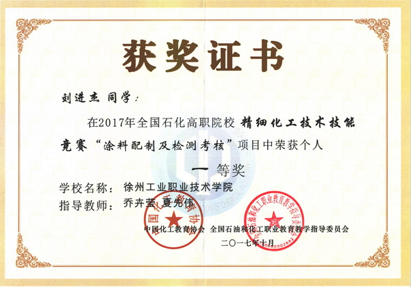 10月25日,由中国化工教育协会、全国石油和化工职业教育教学指导委员会主办,南京科技职业学院承办的2017年全国精细化工技术技能竞赛落下帷幕,来自全国各地的14个参赛队、28名选手参加本次比赛。我校由夏先伟和乔卉莹两位教师指导,化学制药151班刘进杰、郑云馨两位同学组成的参赛团队经过激烈的角逐,荣获团体总分第2名,团体二等奖;在个人独立完成项目“涂料配制及检测考核”中刘进杰获得一等奖,郑云馨获得三等奖;在个人独立完成项目“理论知识考核”中两位同学均取得二等奖。