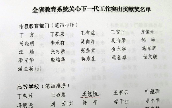 近日,江苏省教育系统关心下一代工作委员会发布《关于表彰全省教育系统关心下一代工作先进集体、先进个人的决定》(苏教关委【2017】13号),我校关工委荣获先进集体,现任常务副主任王健强荣获“突出贡献奖”。这是我校关工委自成立以来第二次获此殊荣,标志着我校关工委各项工作已经进入全省教育系统,特别是高校关工委工作的先进行列。