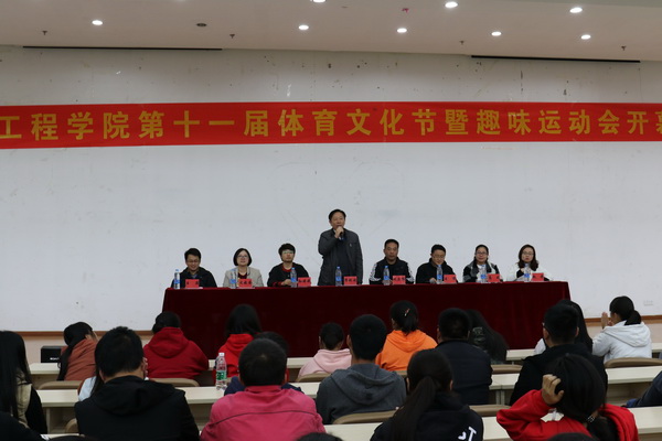 体艺部巩庆伟副部长在开幕式上向同学们强调了开展大学生体育文化节的目的和意义,并对化工学院第十一届体育文化节暨趣味运动会的开幕表示祝贺,鼓励大家走下网络、走出宿舍、走向操场,一起享受体育运动带来的健康和快乐。