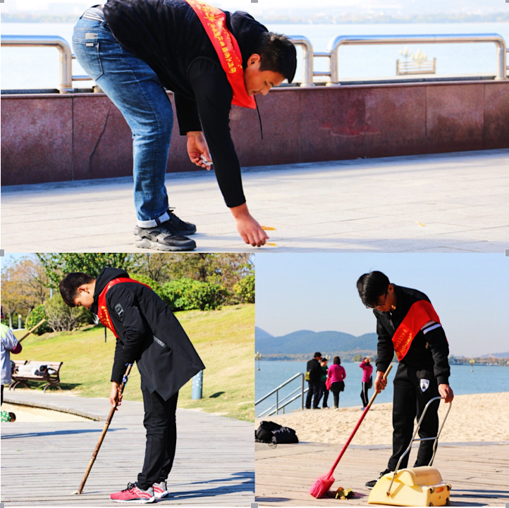 秋风瑟瑟,又到了叶落归根的季节。树叶随着时间的逝去缓缓落下,迎面吹来阵阵冷风。汽车维修171、机电一体化171班全体同学来到云龙湖,看着遍地的落叶,还有各种被丢弃的垃圾,同学们各自分工,有条不紊配合十分默契。同学们买热水送给环卫工人,并让他们坐在板凳上休息,自己接过工具打扫卫生,默默奉献出自己的力量,把最美的青春,献给党的十九大。