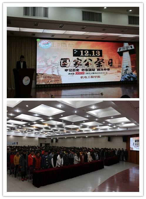 国行公祭,祀我同胞。2017年12月13日是侵华日军南京大屠杀遇难同胞80周年祭日,也是第四个南京大屠杀死难者国家公祭日。机电工程学院团总支组织开展了 “国家公祭日”系列主题纪念活动,引导广大青年学生缅怀先烈、以史为鉴,将激昂的爱国情怀转化为矢志学习钻研、推动中华民族伟大复兴中国梦实现的青春力量。