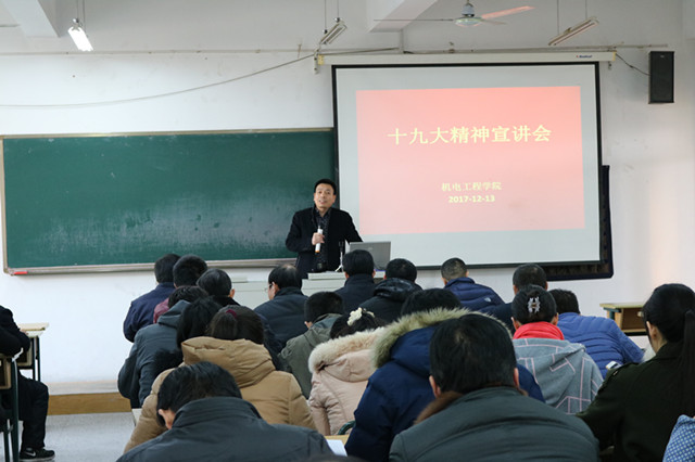 12月13日下午,机电工程学院党总支在B17-311举行十九大精神宣讲会,宣讲会由校宣讲团成员、副院长鲍桂楠同志主讲,机电工程学院全体教师和学生党员参加了此次宣讲会。