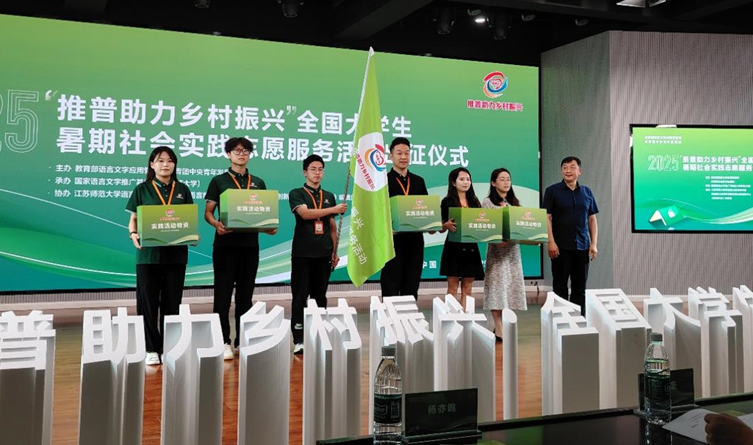 7月10日,团队应邀参加2025年“推普助力乡村振兴”全国大学生暑期社会实践志愿服务活动出征仪式。此次出征仪式由国家语言文字推广基地(江苏师范大学)主任杨亦鸣教授主持,特别邀请了教育部语言文字应用管理司副司长王晖、宣教处干部张栋、江苏省教育厅语言文字与教材工作处处长、一级调研员沈晓冬、江苏师范大学校长杜增吉等领导和基地干部代表出席,出征仪式通过线下线上的形式进行。