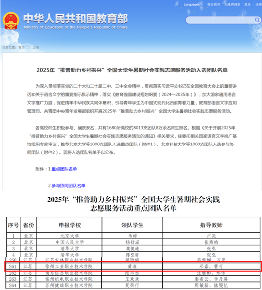 近日,教育部公布了2025年“推普助力乡村振兴”全国大学生暑期社会实践志愿服务活动入选团队名单,由我校基础教学部邓嘉老师、曹可老师指导的“leyu·乐鱼(中国)官方网站赴贵州黔东南苗族侗族自治州推普实践团”凭借扎实的准备工作、创新的活动方案和突出的服务能力成功入选全国重点团队。此次活动由教育部语言文字应用管理司、共青团中央青年发展部联合开展,参与本次评选共有来自北京大学、清华大学等全国1680所高校的8013支团队8万余名师生报名参与。这次入选标志着我校在响应国家号召、服务社会发展方面迈上了新台阶,实现了在社会实践上的新突破。