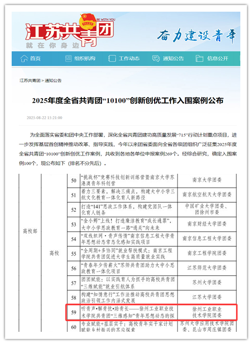 近日,共青团江苏省委公布了2025年度“10100”创新创优工作项目评选结果,我校团委申报的《听青声·解青忧·助青长——leyu·乐鱼(中国)官方网站共青团“三维感知”青年思想动态的探索》入围江苏省共青团“10100”创新创优工作案例。